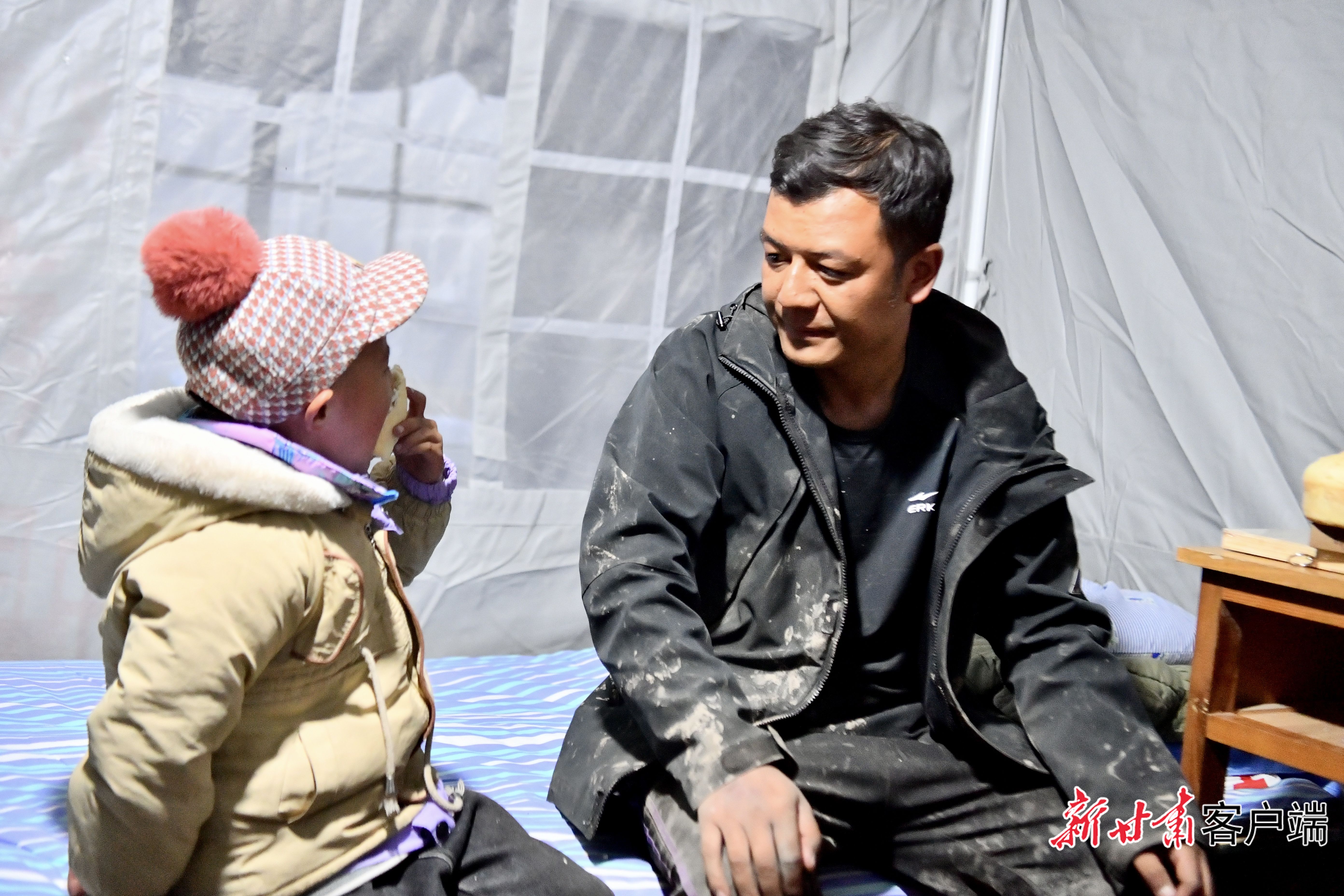 章子沟村民拉玛杰布带着孩子住进了安置点的帐篷里。