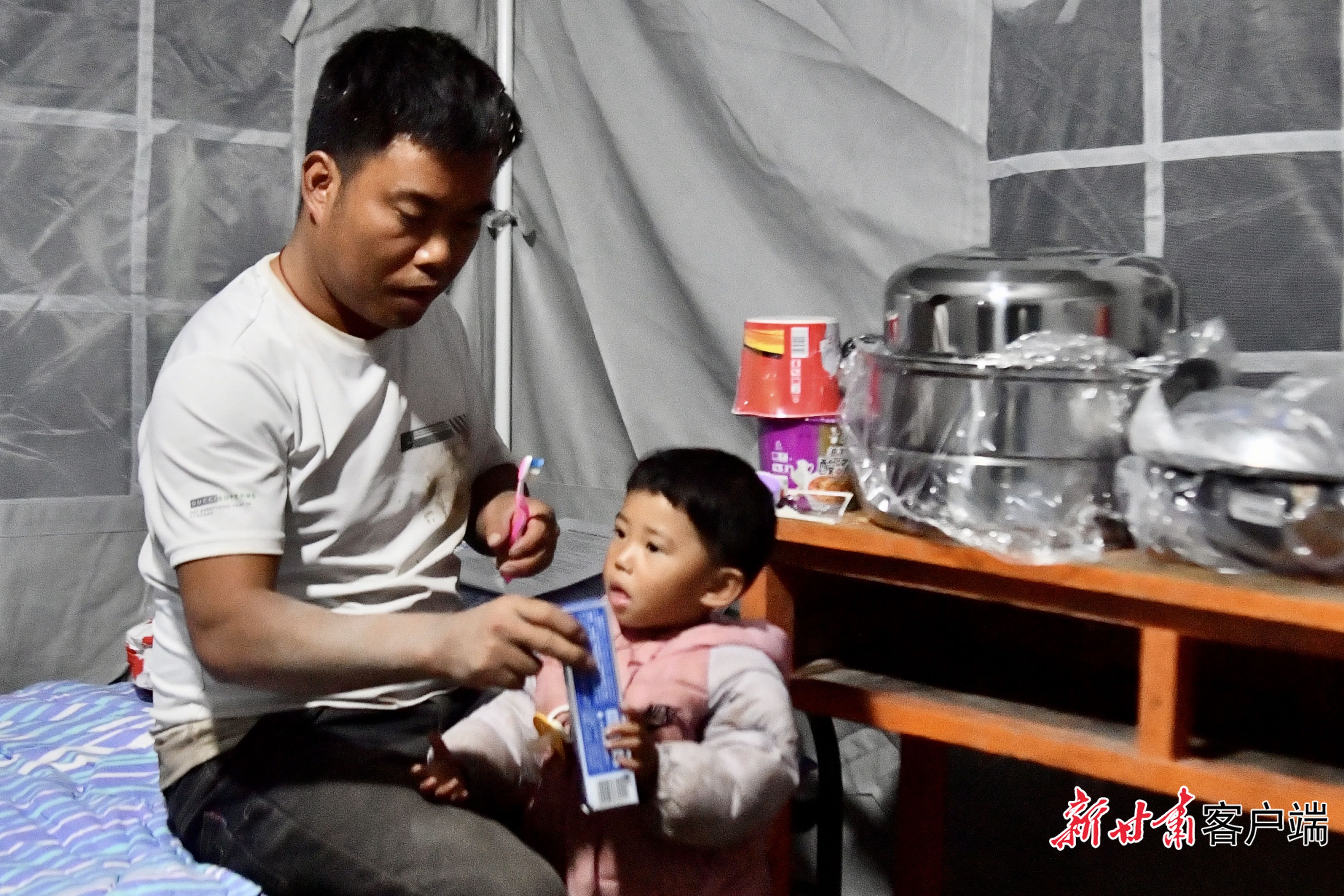 完代在安置点拆开牙具准备带孩子洗漱后休息。