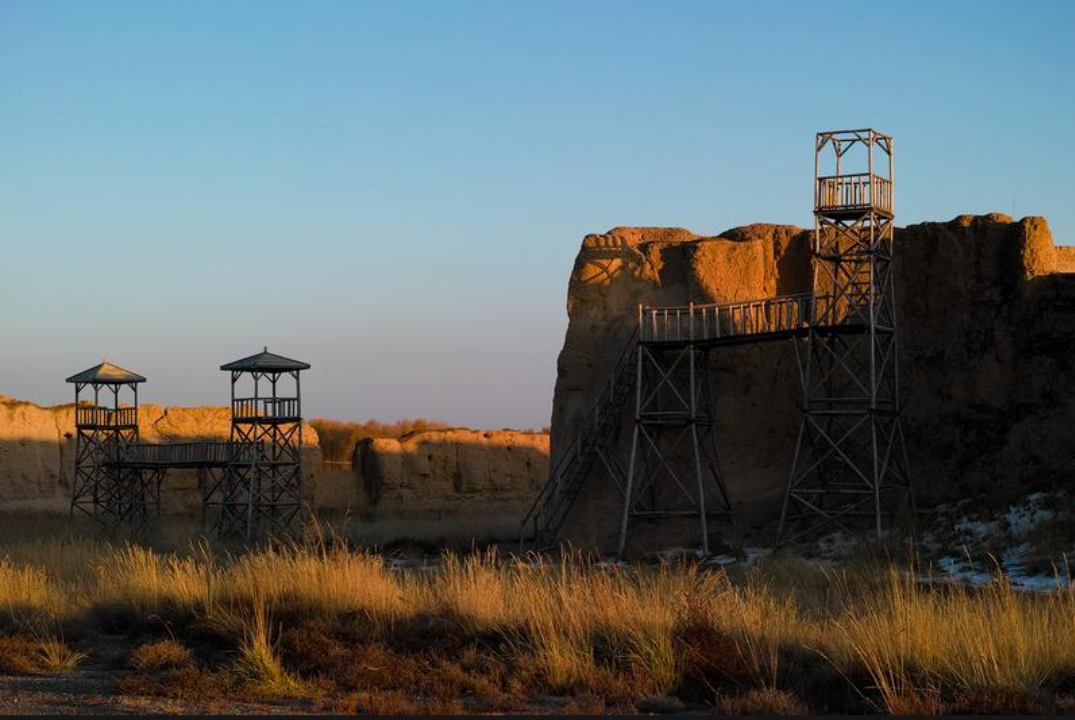 夕阳下,登上古城北边的外城城墙,俯瞰四周,天地广阔,烽燧矗立,草木丰茂,远处的马牙雪山绵延不绝,黑马圈河缓缓流淌……