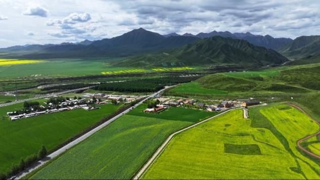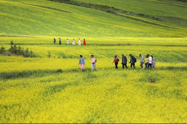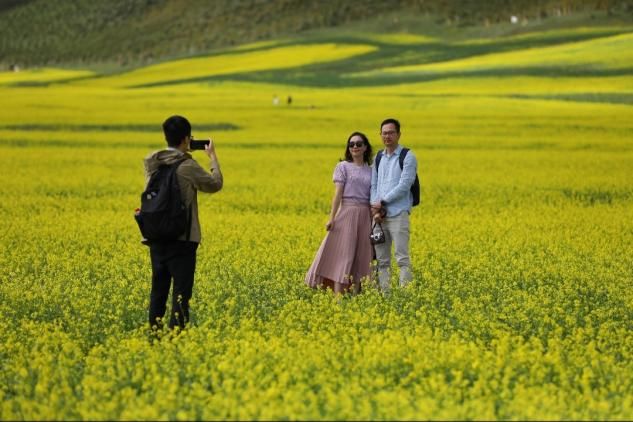 甘肃省张掖市民乐县油菜花竞相开放,油菜花汇成金色花海,吸引众多游客前来游玩与拍摄。