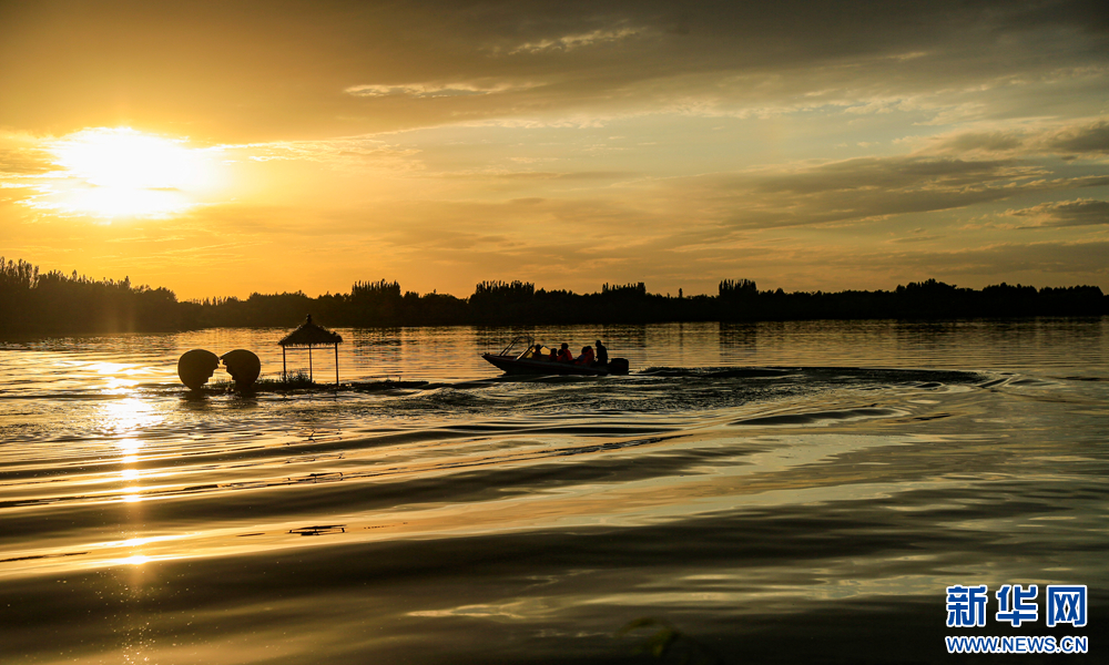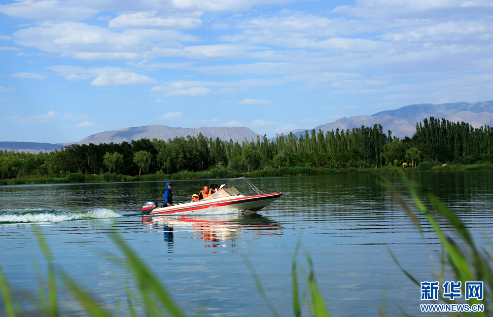 7月16日,在甘肃省张掖市甘州区芦水湾生态旅游度假区,游客乘画舫在云中湖、居延湖中游览享清凉。新华网发(陈礼 摄)