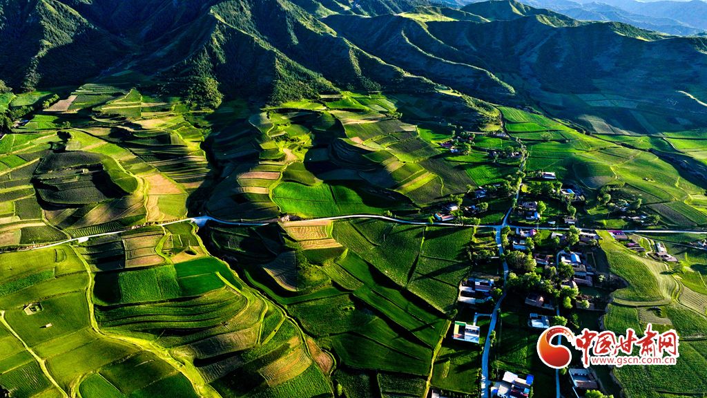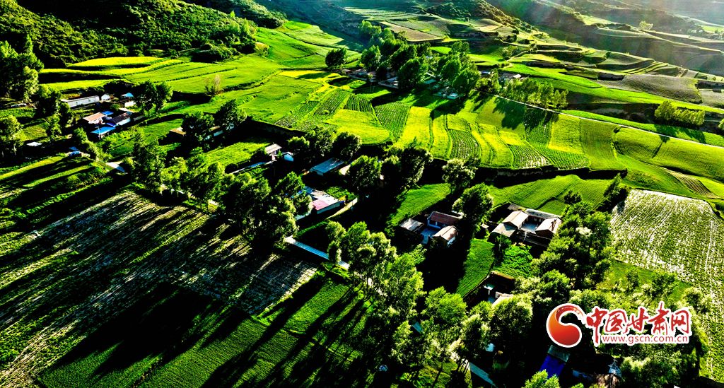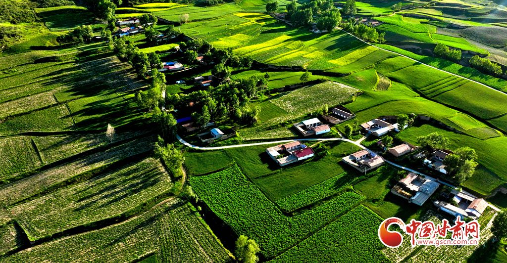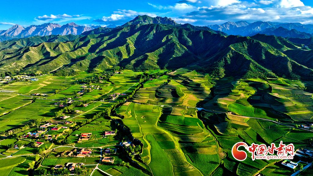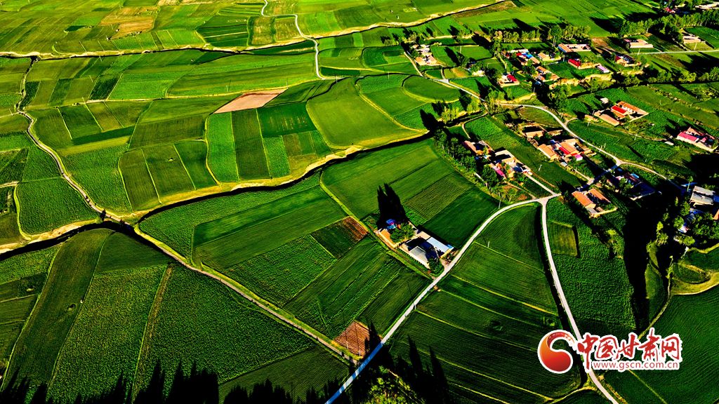 夕阳映衬下的祁连山北民乐县丰乐镇易家湾村,绿油油的庄稼生长旺盛,林木蓊郁层林尽翠,呈现出生机勃勃的景象,犹如“巨幅绿毯”。