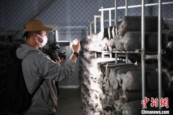7月17日,甘肃省古浪县,参加“丝路风采 如意甘肃”联合采访活动的两岸及香港记者在当地养菌出菇的冷库内采访拍摄。中新社记者 李雪峰 摄