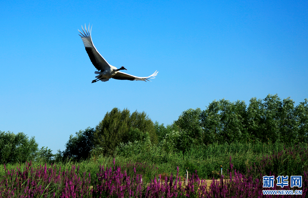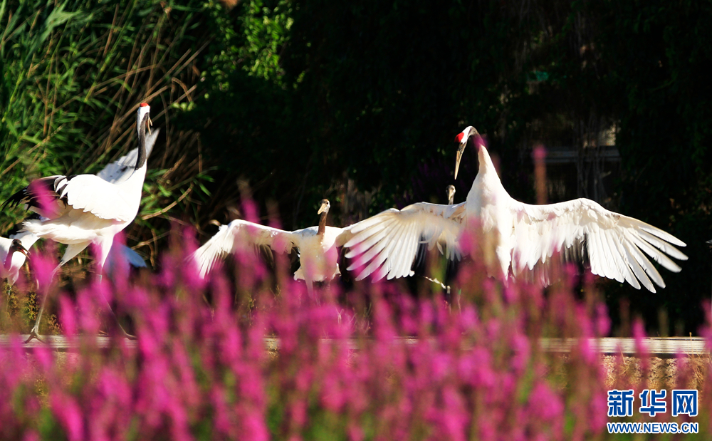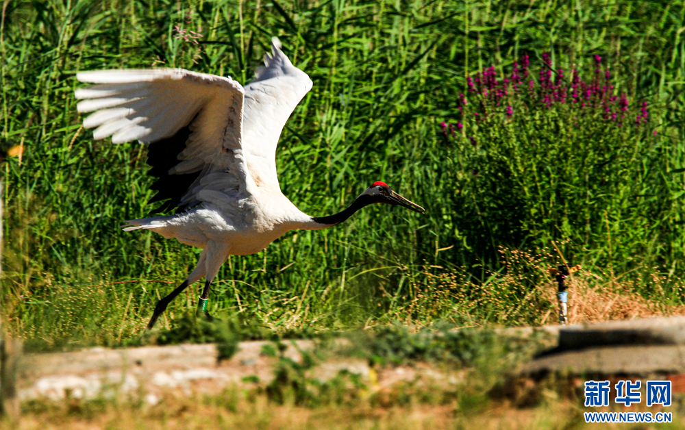 18日,甘肃省张掖国家湿地公园郁郁葱葱,丹顶鹤悠闲觅食,自在飞翔,呈现出一派生机勃勃的生态美景。新华网发(陈礼 摄)