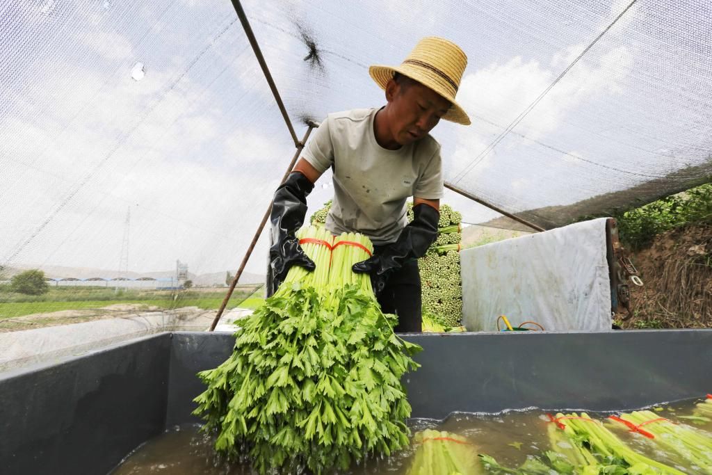 7月20日,甘肃省定西市安定区香泉镇农民在地头简单清洗蔬菜,准备装车。新华社发(王克贤 摄)