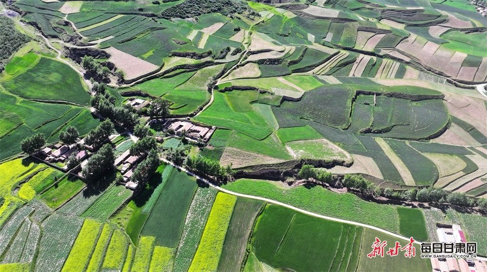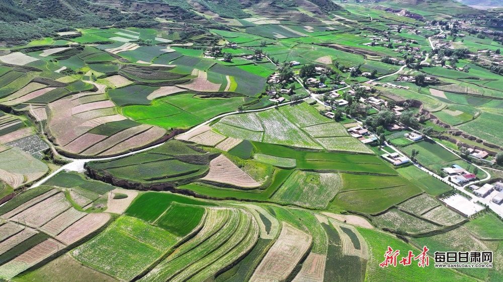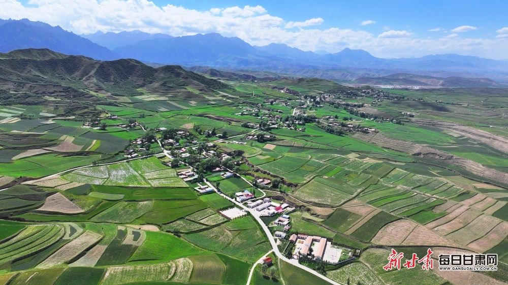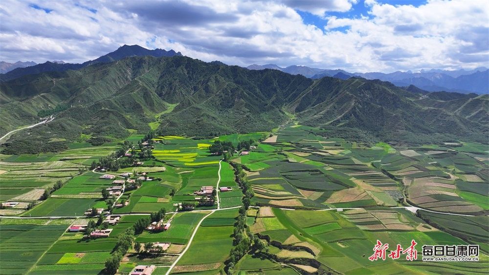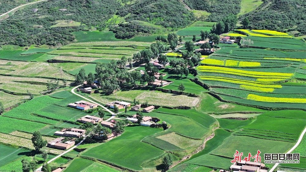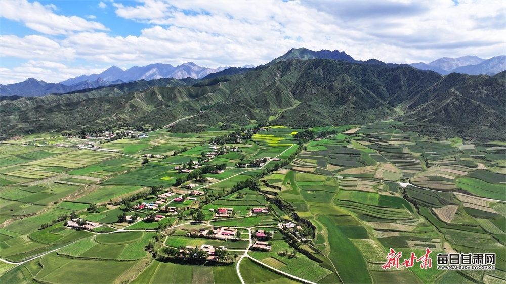 炎炎夏日,位于祁连山北麓的张掖市民乐县丰乐镇易家湾村林木蓊郁,绿意盎然,从高处俯瞰,田地、民居、山间公路等交相辉映,各种颜色的田块在广袤的田野上构成美妙的几何图案,编织成了一幅幅生态乡村美景图。