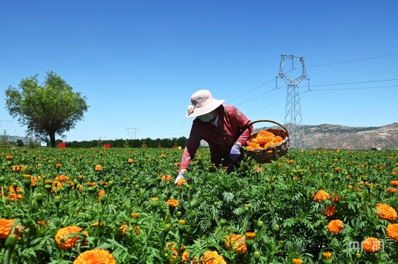 盛开的万寿菊,吸引了众多游客前来打卡拍照,当地村民也穿梭于田间,忙着采摘首茬万寿菊。