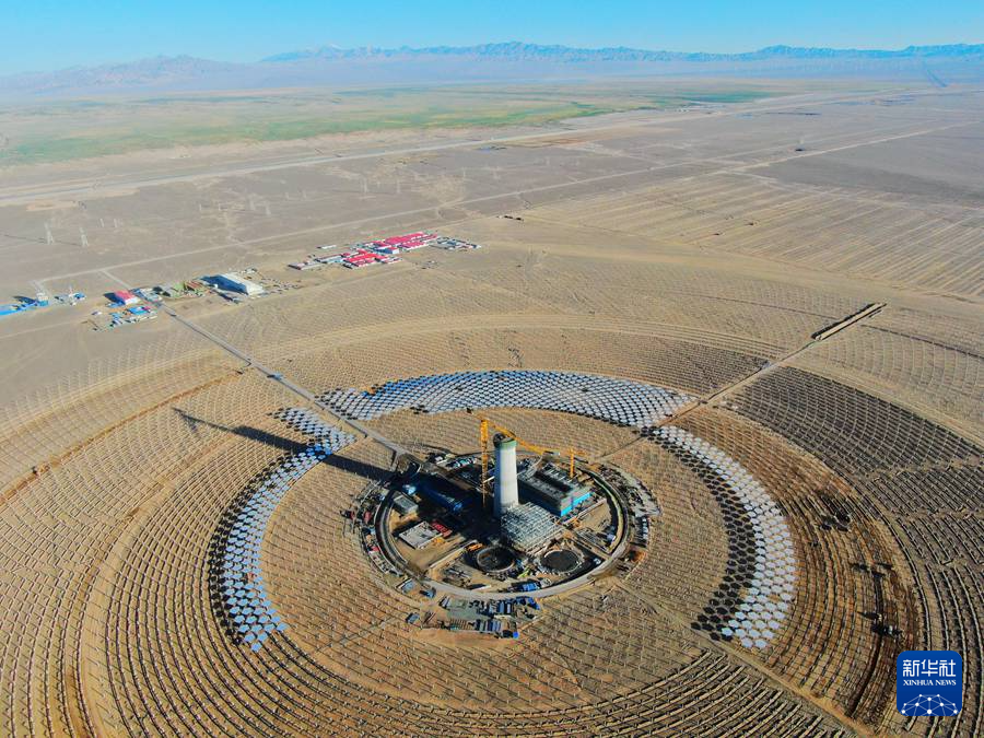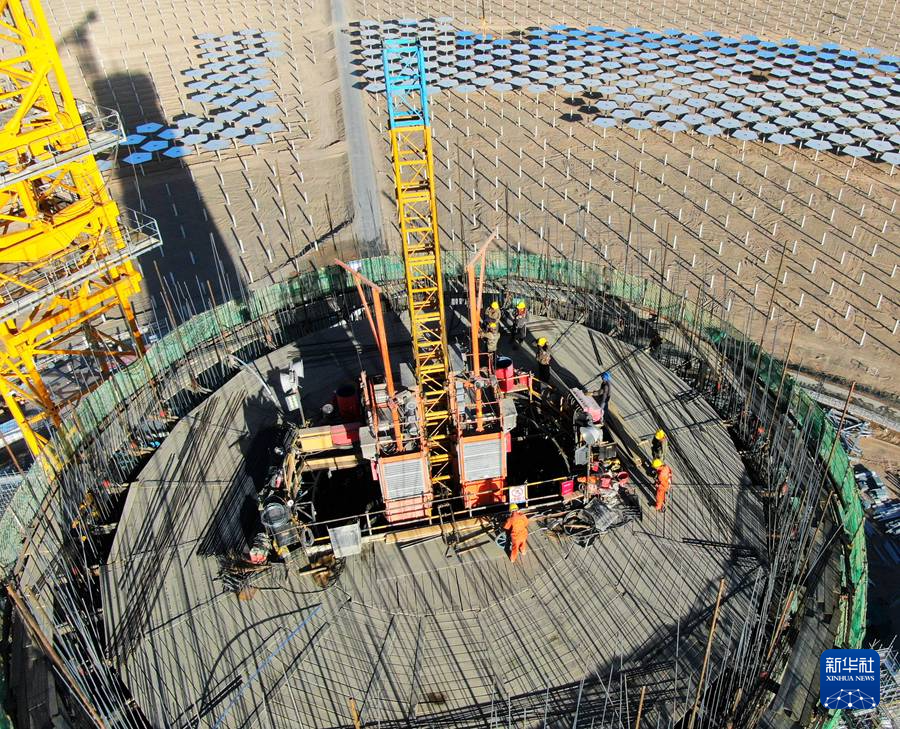 7月21日,在阿克塞千万千瓦级可再生能源多能互补基地,工人在汇东新能源75万千瓦光热+项目建设现场施工。新华社发(马晓伟 摄)