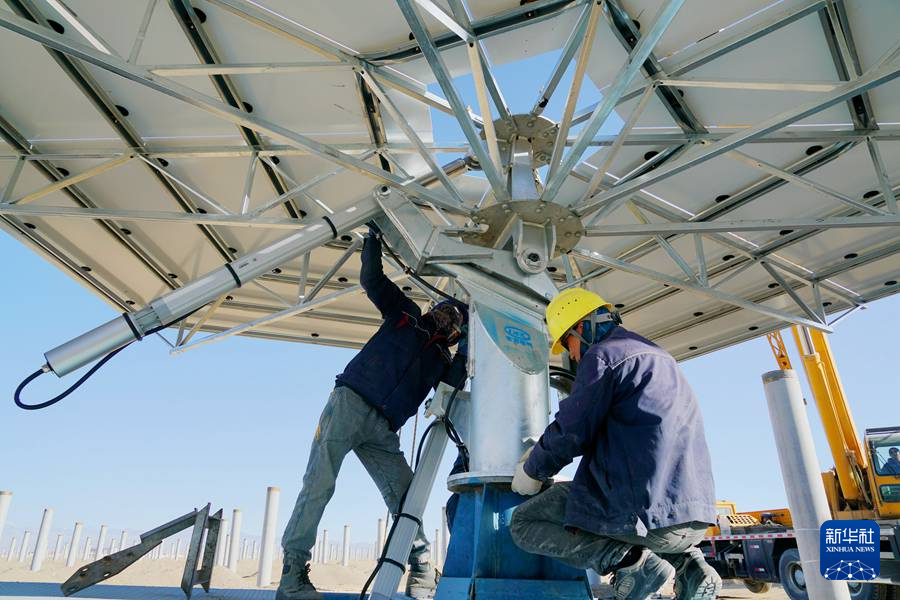 7月21日,在阿克塞千万千瓦级可再生能源多能互补基地,工人在汇东新能源75万千瓦光热+项目建设现场安装定日镜。新华社发(马晓伟 摄)