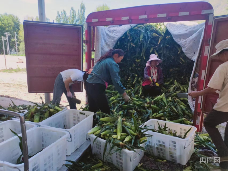 亮平种养殖农民合作社群众正在对水果玉米进行分拣装车(央广网发 赵琼 摄)