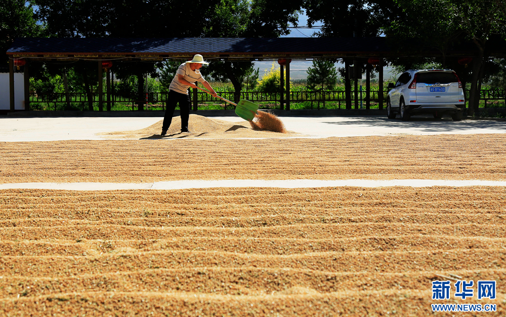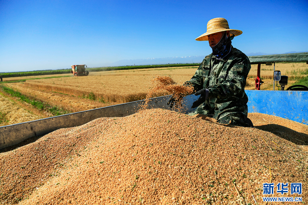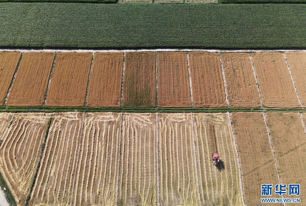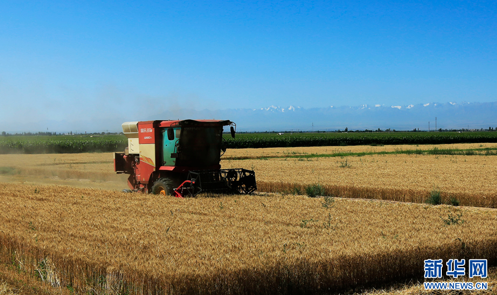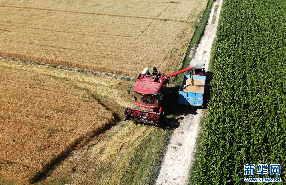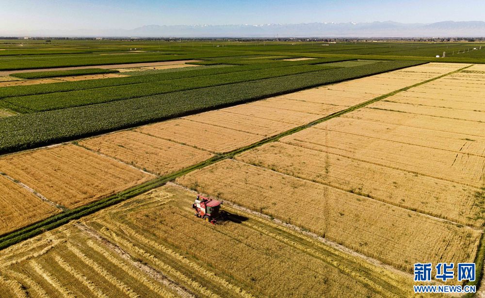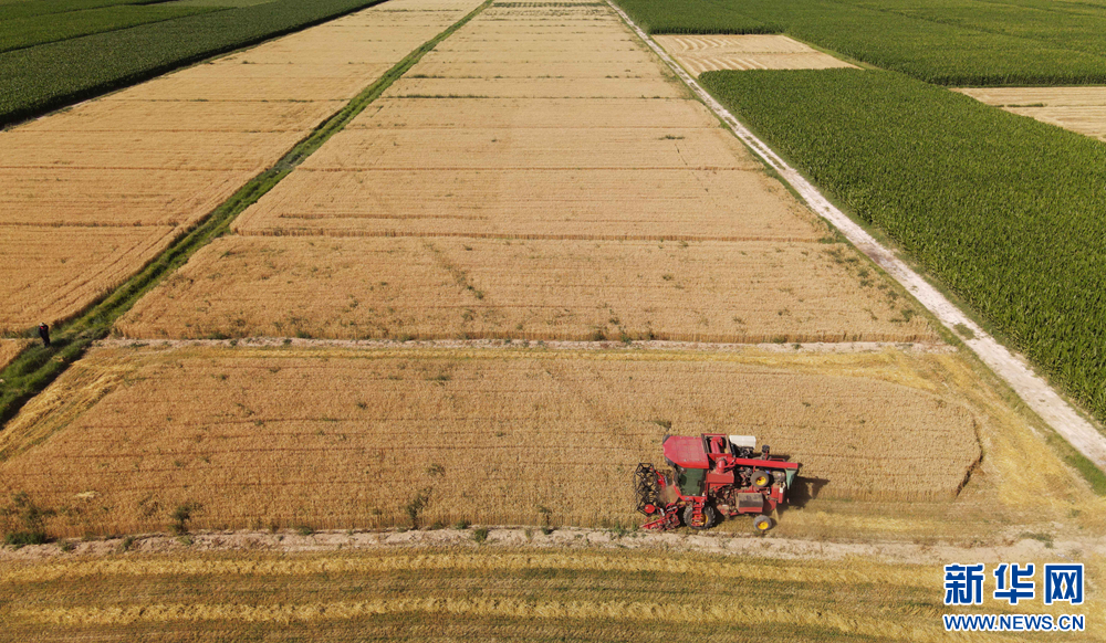 近日,甘肃省张掖市甘州区碱滩镇野水地村的400多亩小麦进入收割期,村民们抢抓农时收割小麦,田间一派丰收的繁忙景象。新华网发(陈礼 摄)