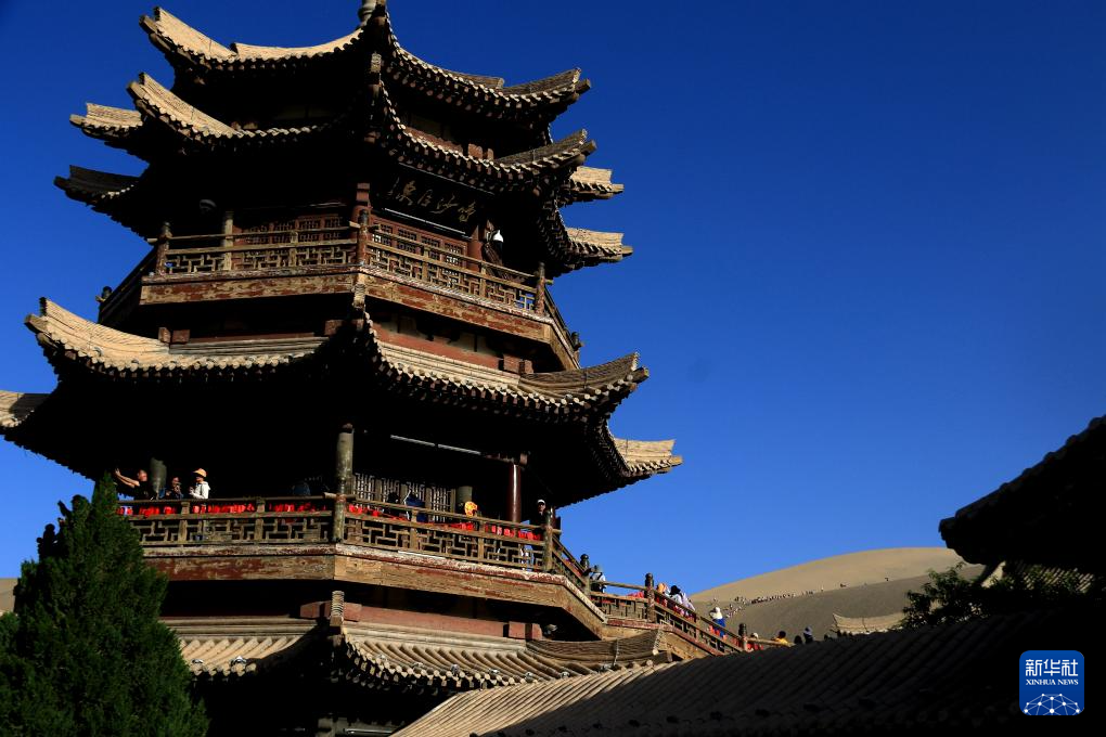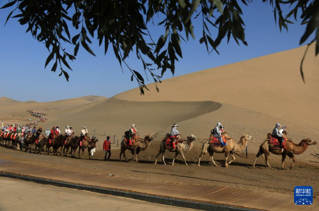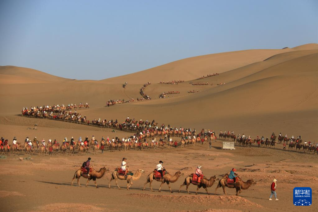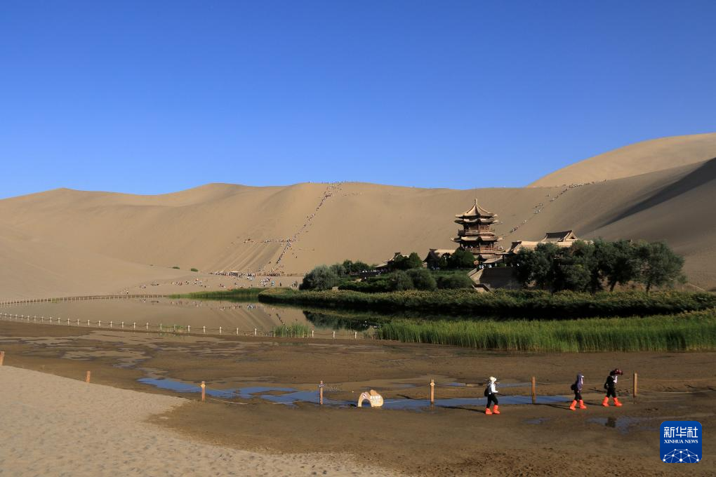 初秋时节,甘肃省敦煌市碧空如洗,鸣沙山月牙泉景区景色如画,引人入胜。