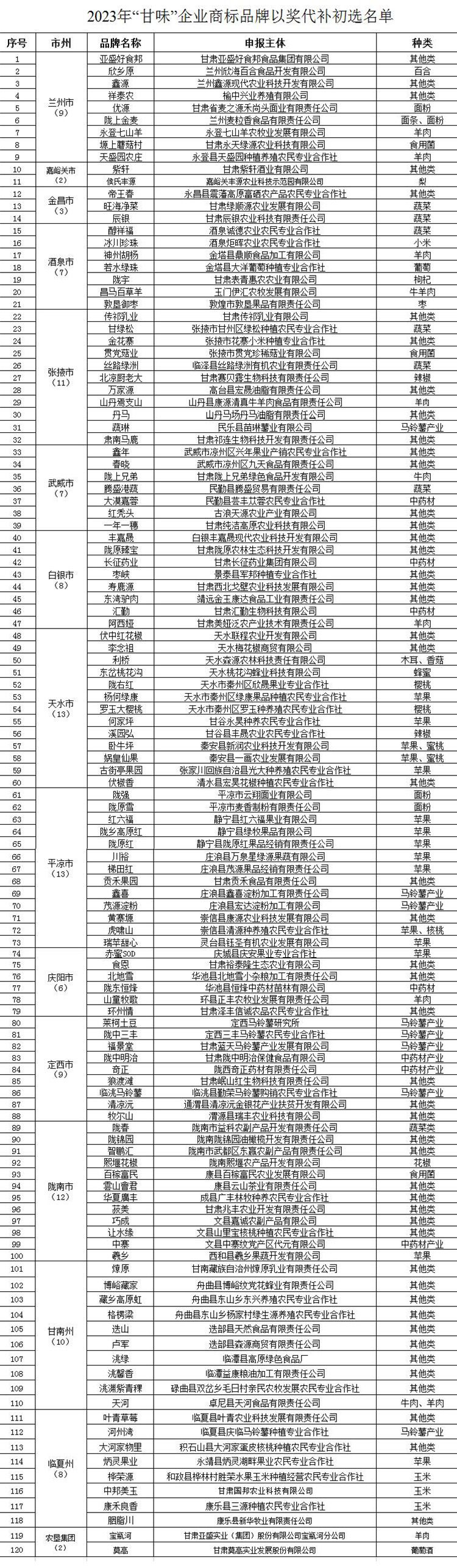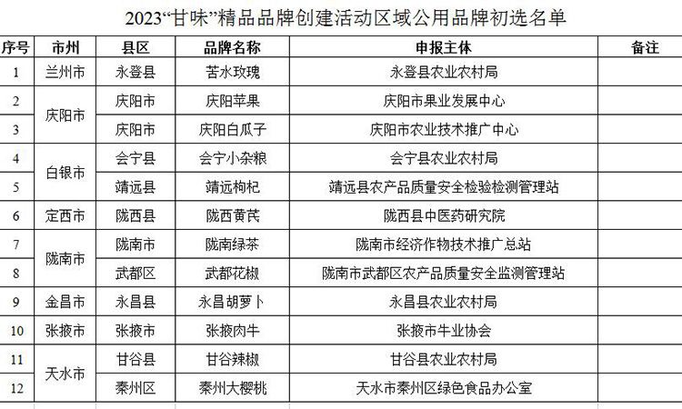 在各地品牌主体自主申报、市县农业农村部门审核推荐的基础上,经形式性审查,初选产生了12个“甘味”区域公用品牌和120个“甘味”企业商标品牌,现予以公布。