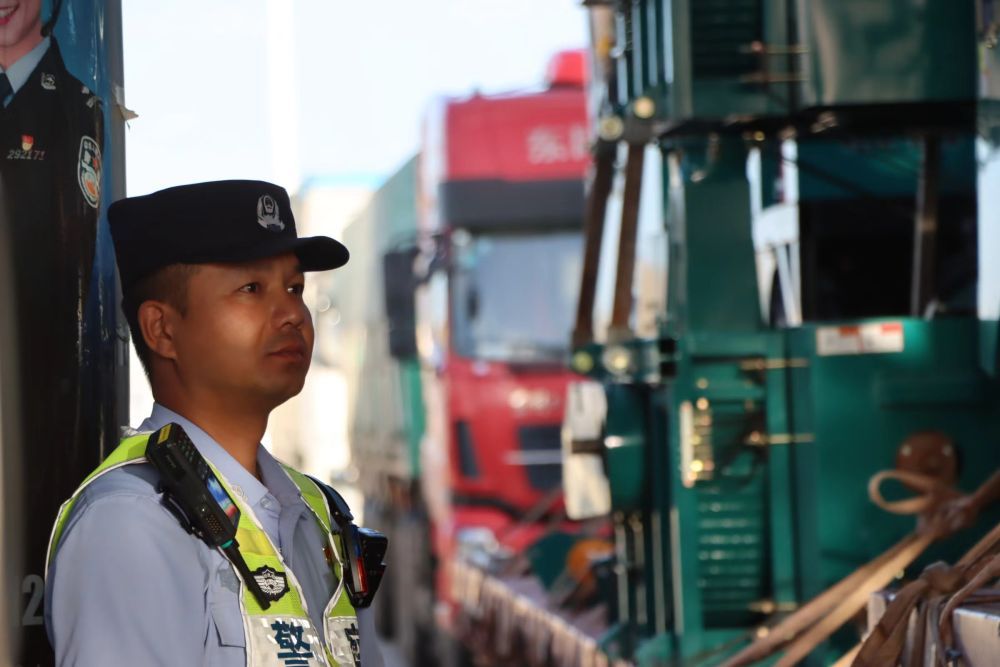 图说:2023年8月23日,公婆泉边境检查站站长张超在执勤现场查验往来车辆。(新华社记者王鹏宇摄)