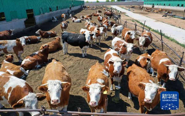 在甘肃省武威市古浪县西靖肉牛养殖基地,一群西门塔尔牛在围栏中休憩(2023年6月15日摄,无人机照片)。新华社记者 郭刚 摄