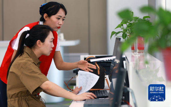 在甘肃省武威市政府政务服务中心,志愿者(后)在为市民办理业务提供服务(2023年6月16日摄)。新华社记者 郭刚 摄