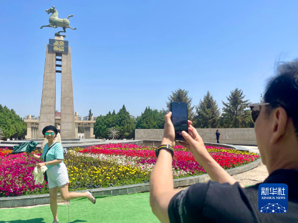 游客在甘肃省武威市天马大景区“马踏飞燕”拍照留念(2023年6月16日摄)。新华社记者 郭刚 摄