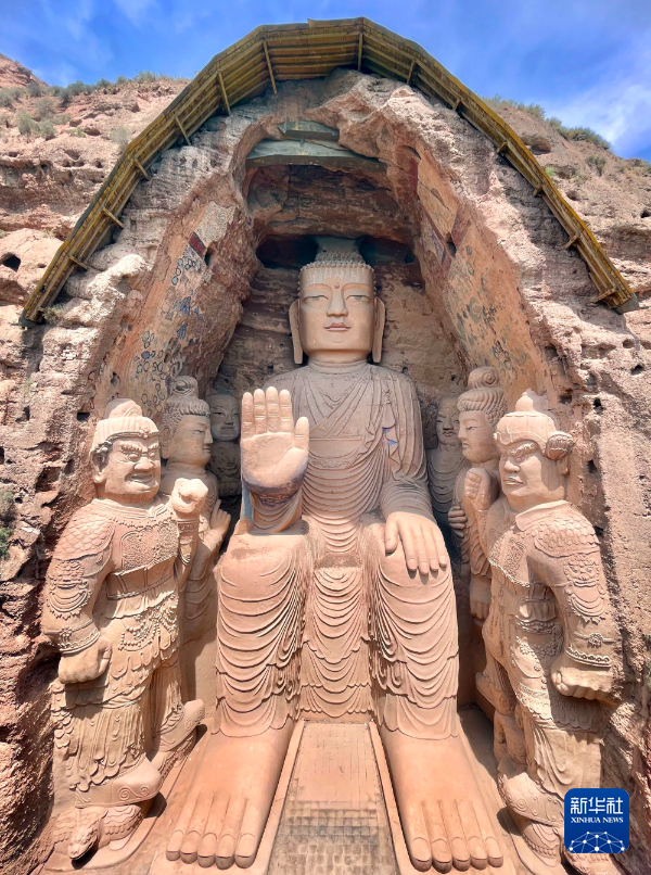 这是位于黄羊河水库之滨的“石窟鼻祖”——甘肃省武威市天梯山石窟(2023年6月14日摄)。新华社记者 郭刚 摄