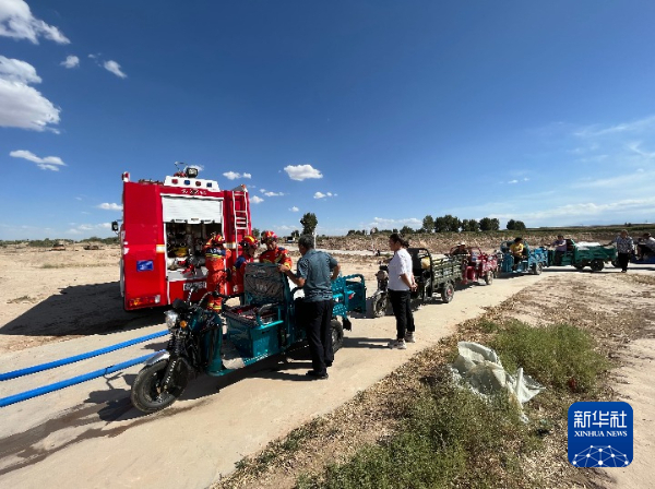 8月23日,张掖市山丹县东乐镇城东村群众排队领取生活用水。新华社发