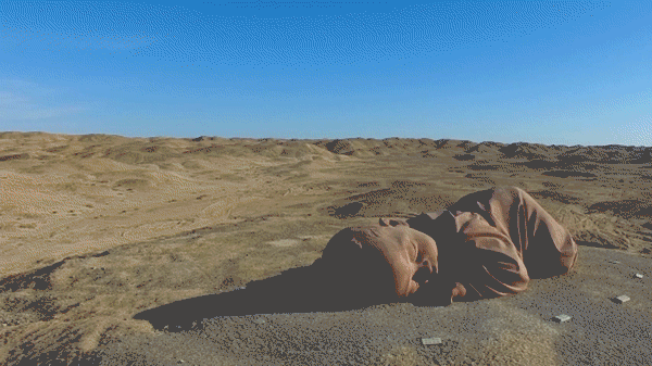 从高空俯瞰,荒芜的戈壁滩上安静地躺着一个熟睡的孩子,红砂岩雕刻艺术将婴儿的衣服褶皱塑造得惟妙惟肖,那便是“大地之子”。