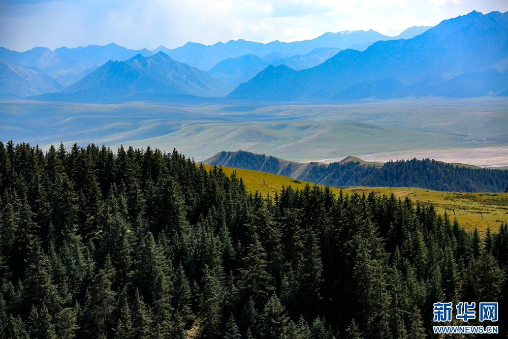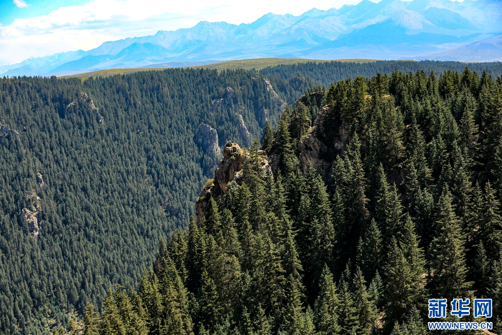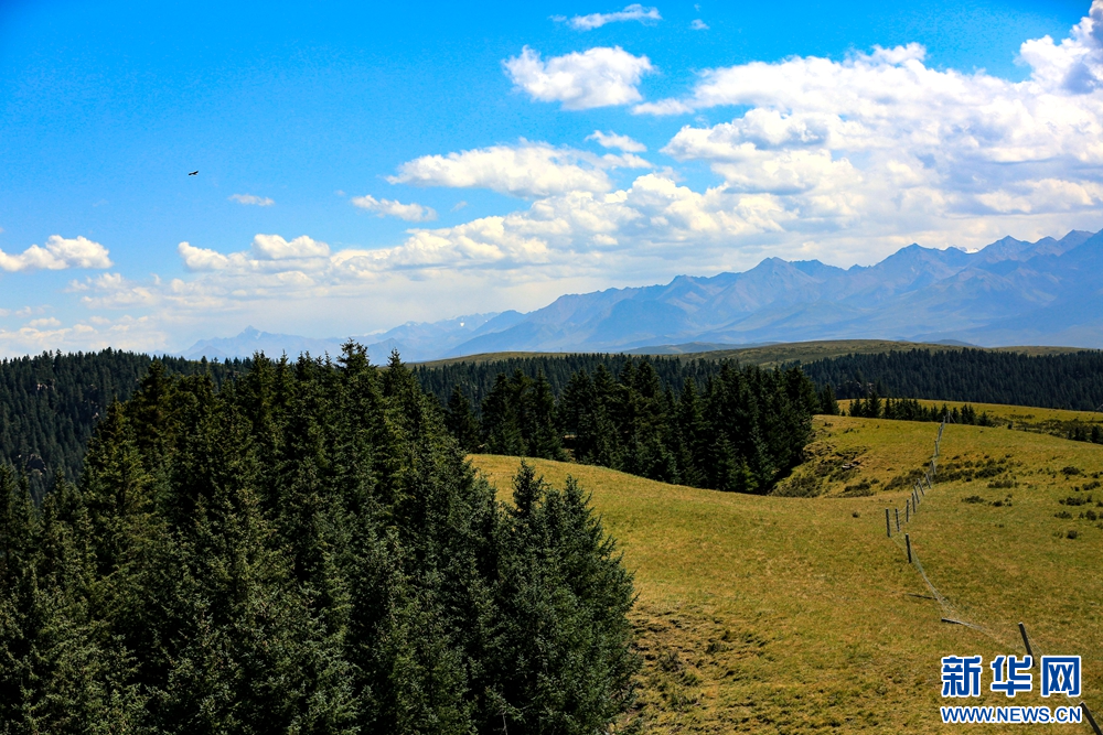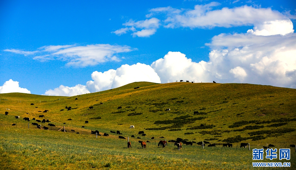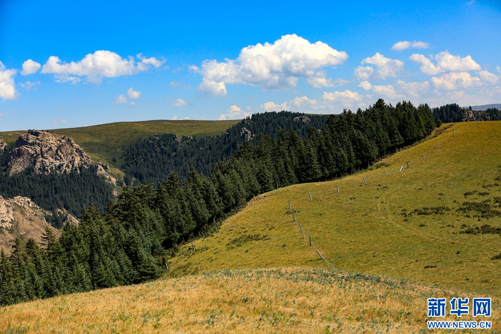 初秋时节,甘肃省山丹马场境内的窟窿峡,白云悠悠、松林茂密、怪石嶙峋,草原披秋色、牛马满山坡,美若壁纸。新华网发(陈礼 摄)