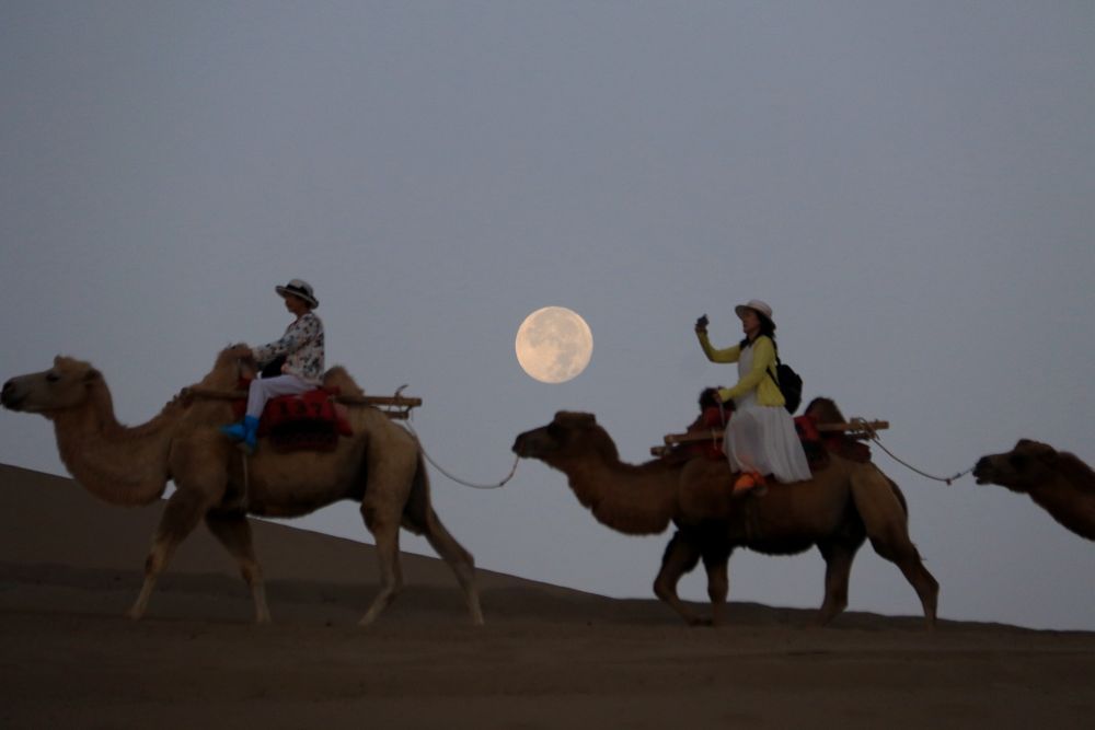 当日清晨,一轮圆月悬挂在甘肃省敦煌市鸣沙山月牙泉景区上空,游客骑乘骆驼,领略大漠风光。