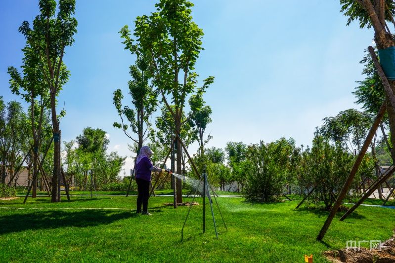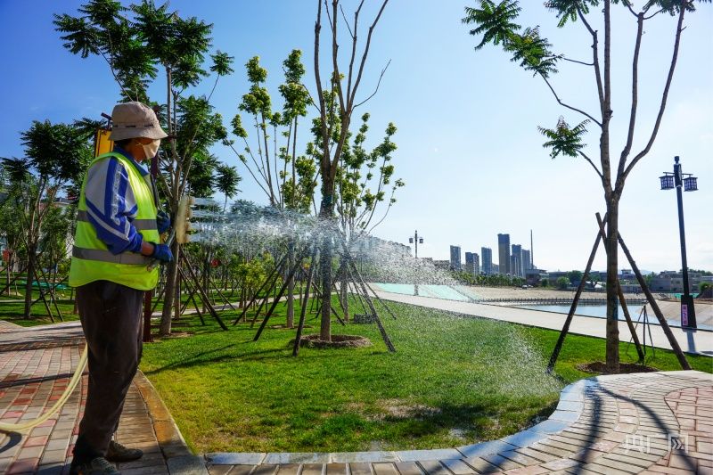 工人对牛谷河西段水岸绿化带进行喷水养护(央广网发 张子斌 摄)