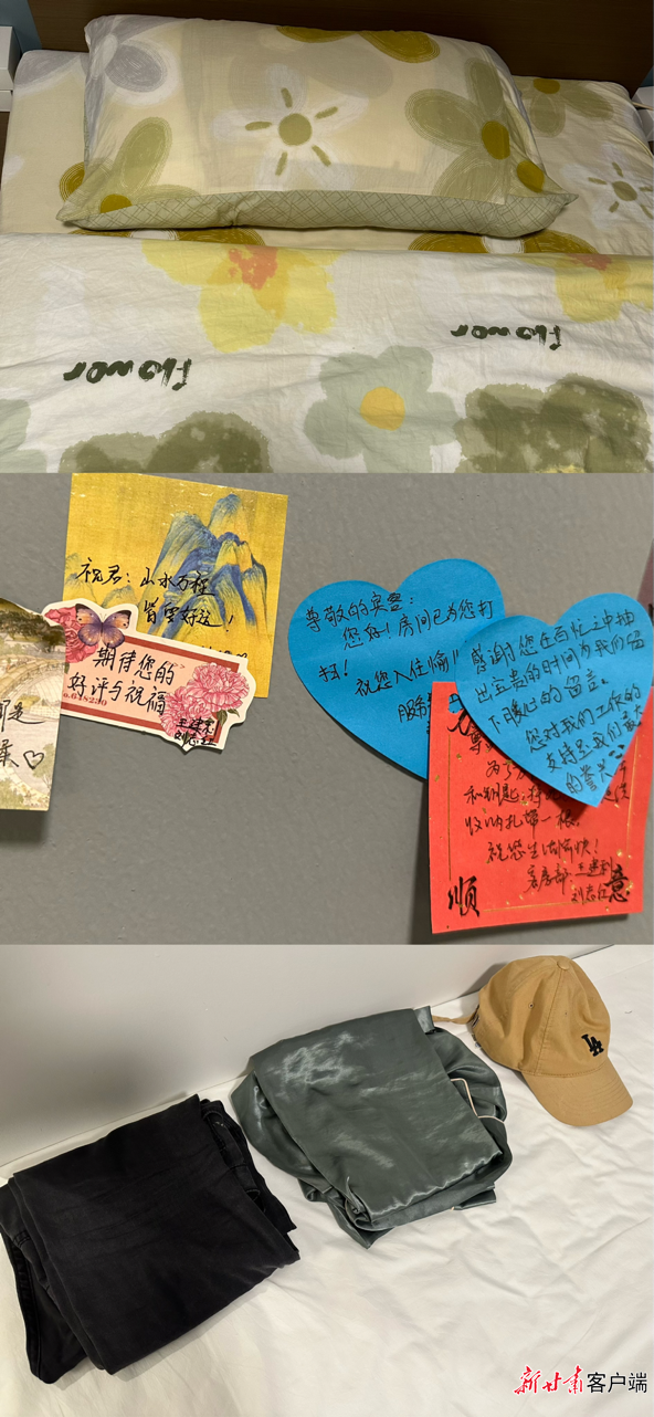 如果说“小青荷”温暖着我的每一天,那这两位“姐姐”给了我如同家的爱。我和她们素未谋面,不知道她们的年龄,也不知道她们的样子,但这种感受,像被姐姐照顾般细致入微。无论几点回来,我们的房间永远干净整洁。整齐的床铺,叠放好的衣物,暖心的小纸条,让这里如同我们的家。这个“家”,正是因为有她们在背后默默呵护,才让我们能够更安心工作。