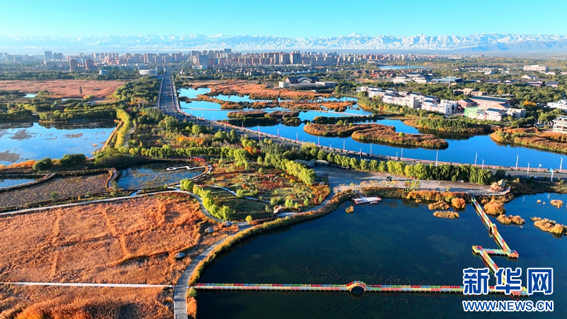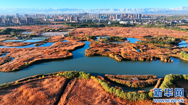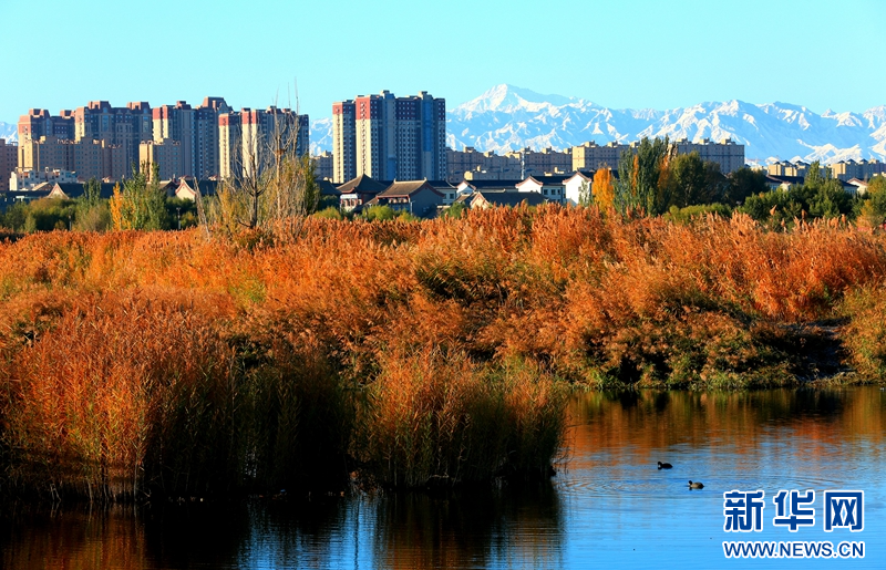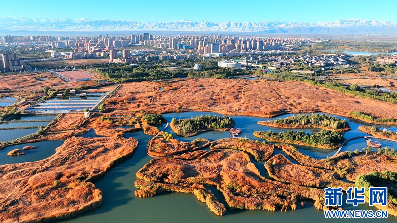 这是10月19日拍摄的甘肃省张掖市甘州区芦水湾生态景区。祁连山下,湖水澄明如镜,树木叠翠流金,呈现出别样风光。新华网发(杨潇 摄)