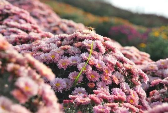 菊花的花瓣不是很大,但总给人以花团锦簇之感,一簇簇、一丛丛、一片片,盛开于山野田间、沟缝石崖、墙角路边。她的根扎在哪里,就繁衍生息到哪里,今年是一株,明年就是一片,不择环境,团结向上,不惧严寒。她不与百花斗艳争宠,独守一方清冷与高洁,可谓是高风亮节,威武不屈,不鸣则已,一鸣则惊人。待到万物萧条时,到处都变成了菊花的舞台,菊花的世界,菊花的优秀品德也许就在于此吧,故而人们把她列为岁寒四友之一。