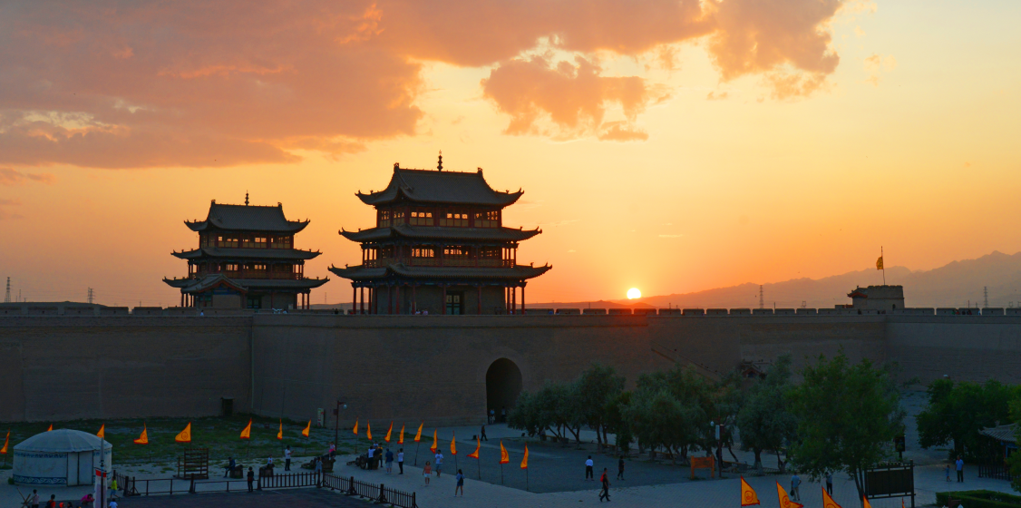 嘉峪关关城位于嘉峪关市西5公里处最狭窄的山谷中部,城关两侧的城墙横穿沙漠戈壁,北连黑山悬壁长城,南接天下第一墩,是明长城最西端的关口,历史上曾被称为河西咽喉,因地势险要,建筑雄伟,有天下第一雄关、连陲锁钥之称。嘉峪关是古代“丝绸之路”的交通要塞,素有中国长城三大奇观之一(东有山海关、中有镇北台、西有嘉峪关)的美称。