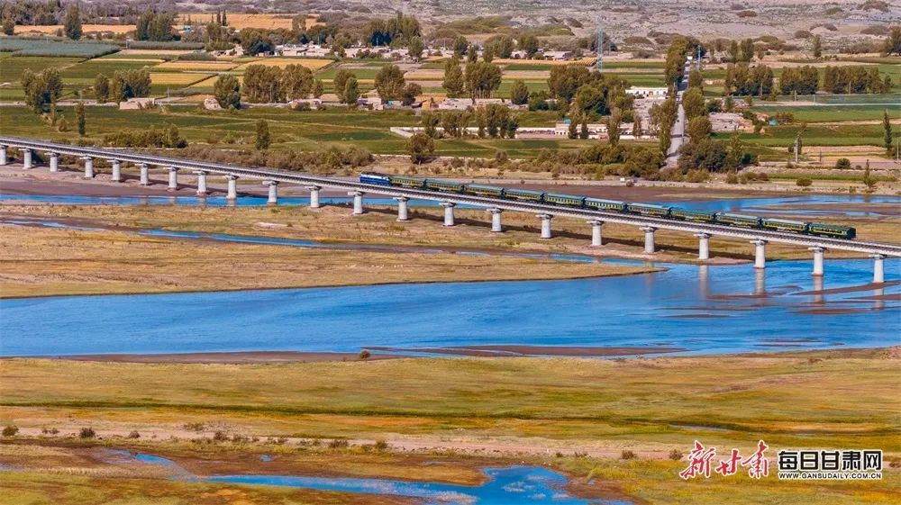 金秋时节的黑河流域水草丰美、芦苇成片、白鹭飞翔、天鹅游弋,众鸟与酒额铁路交相辉映,构成了一幅人与自然和谐共生的美丽画卷。新甘肃·每日甘肃网通讯员 宋佳龙