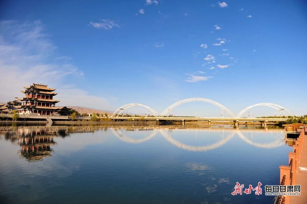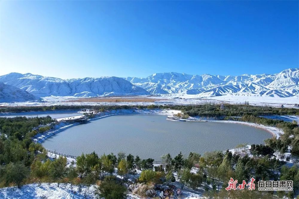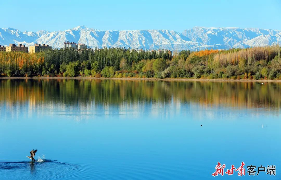 10月19日,张掖市甘州区芦水湾生态景区,湖水澄明如镜与城市楼群、白雪皑皑的祁连山,构成一幅美丽的生态画卷。新甘肃·甘肃日报通讯员 杨永伟