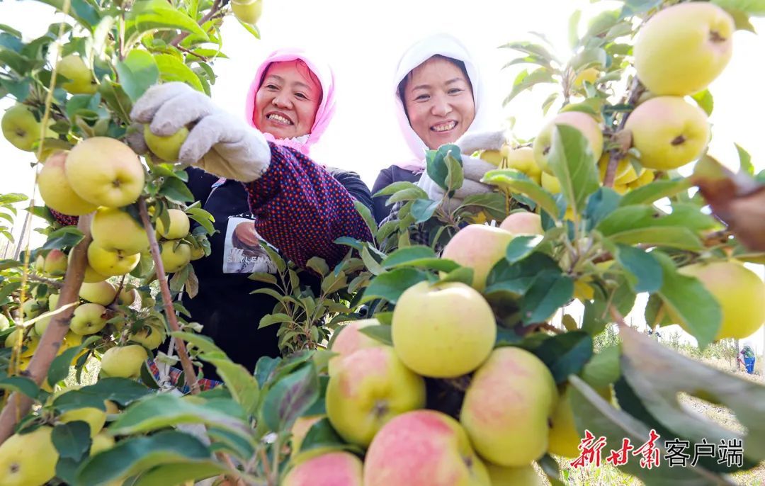 10月9日,甘州区明永镇永济滩发年农产品矮化密植苹果种植基地上,果农正在采摘矮化密植维纳斯黄金苹果。新甘肃·甘肃日报通讯员 王 将 吕 杰