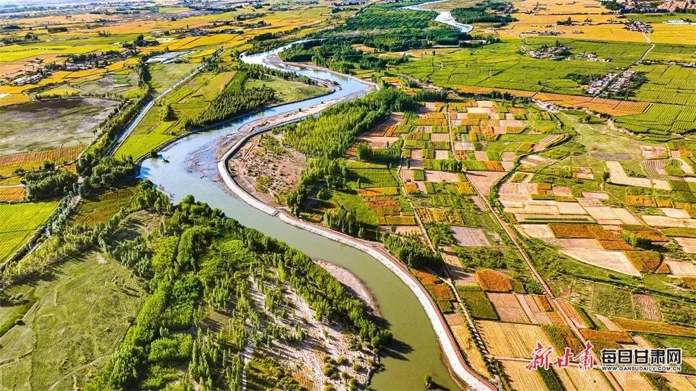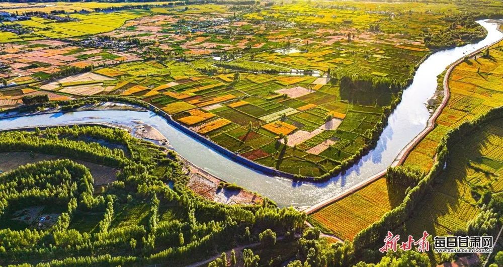 金秋时节,张掖市临泽县黑河两岸丰收的田野在夕阳的映照下色彩斑斓,构成大自然最美的画卷。新甘肃·每日甘肃网通讯员 王将 张延平
