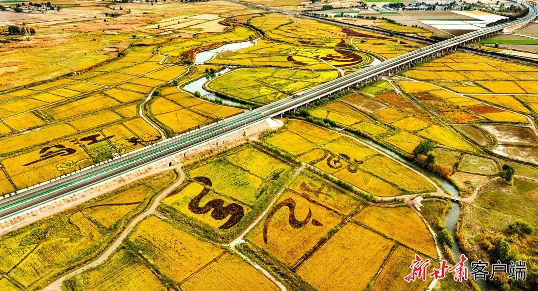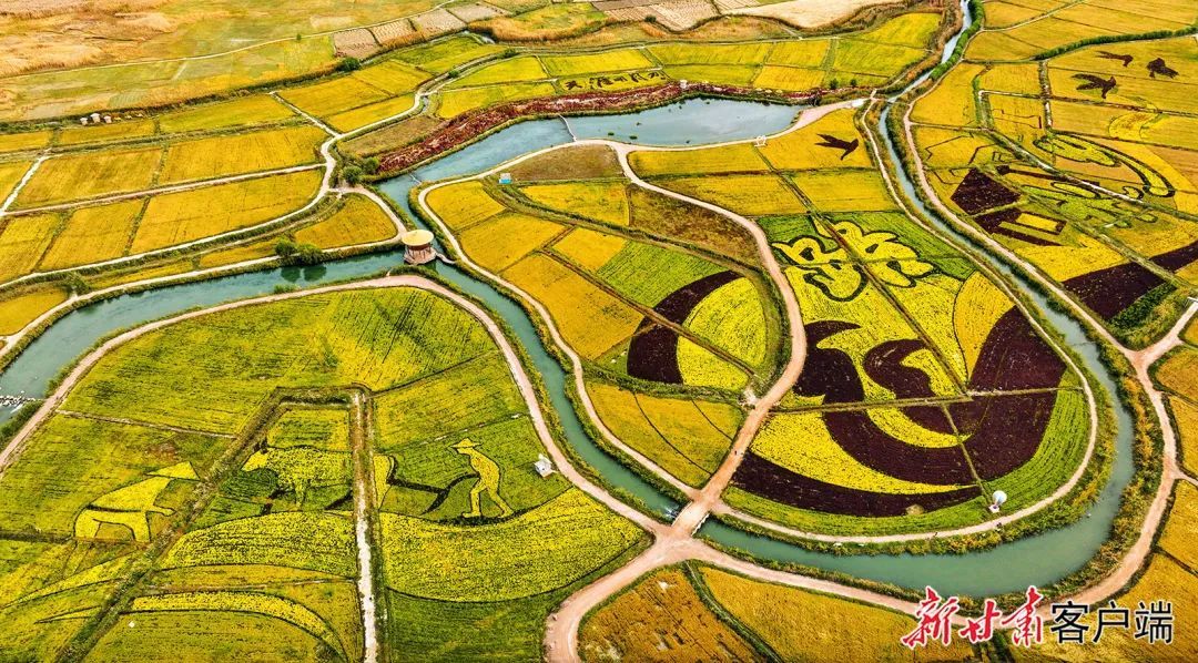 10月12日,张掖市甘州区乌江镇新河田园综合体成熟的千亩水稻、千亩玉米,像铺在大地上的金色地毯。