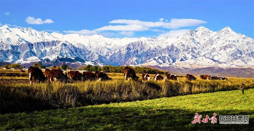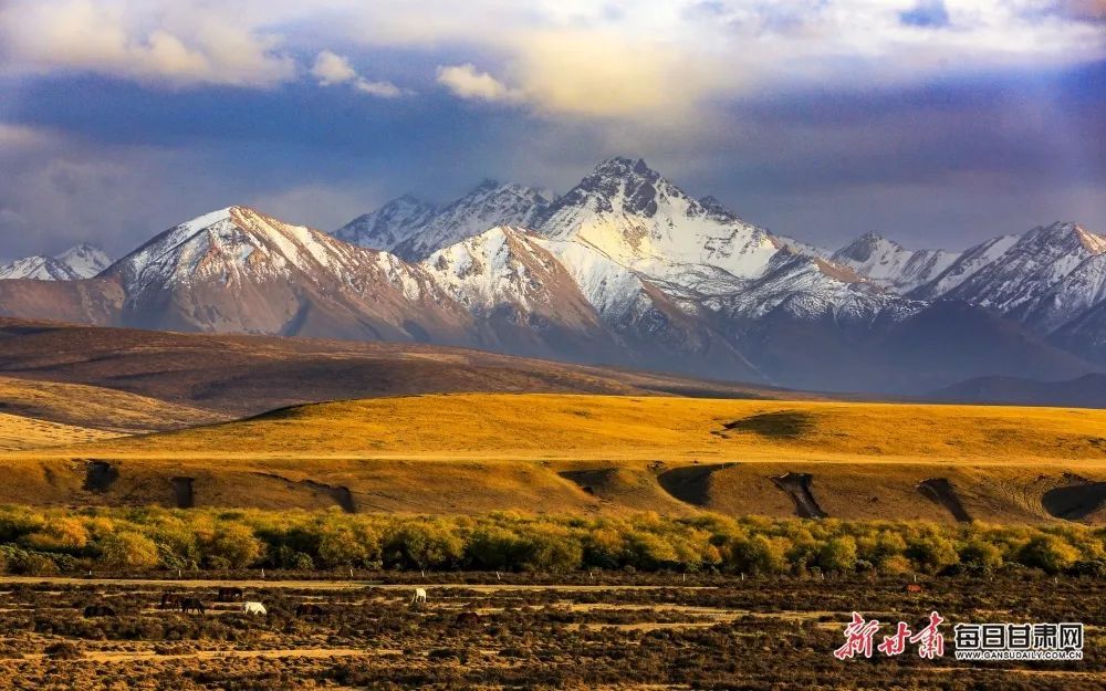 秋日的山丹马场草原,远处连绵的草原广阔无垠,深深浅浅的黄色在草地上绵延起伏,与天边的雪峰相接。新甘肃·每日甘肃网通讯员 陈礼