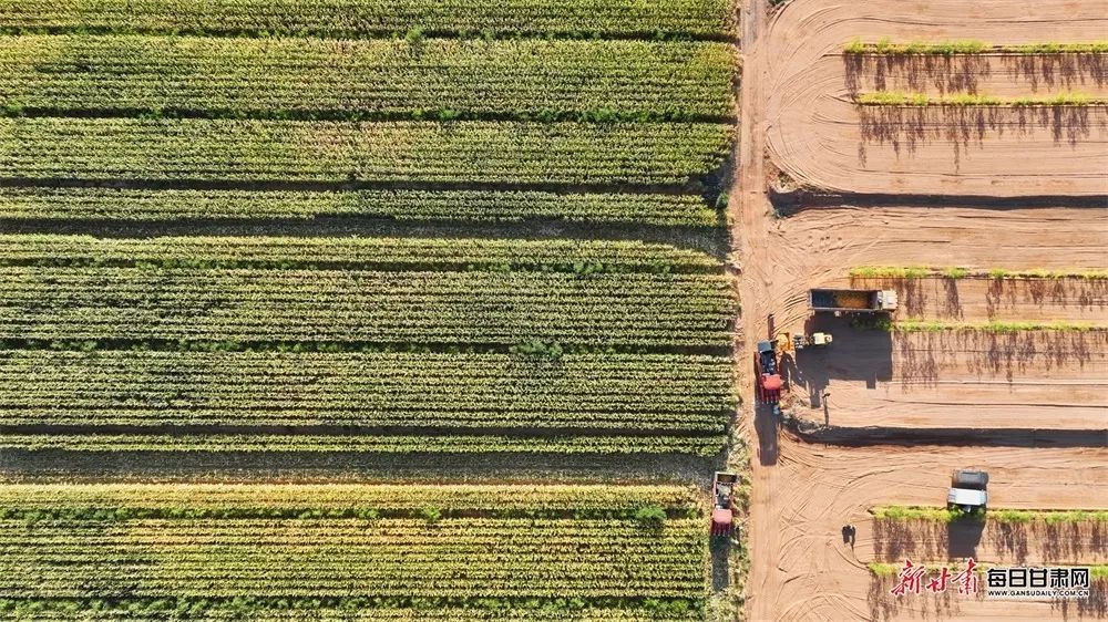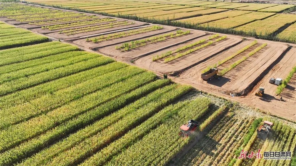 张掖市临泽县板桥镇古城村北部沙漠田野,农民驾驶收割机正在收割枣林套种的玉米。新甘肃·每日甘肃网通讯员 杨永伟