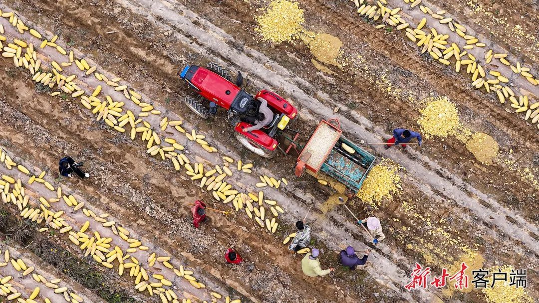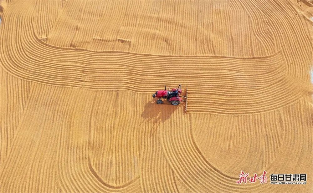 在金塔县金塔镇塔院村的玉米晾晒场,种植户正在用机械翻晒玉米, 呈现一派繁忙的景象。新甘肃·每日甘肃网通讯员 曹红祖