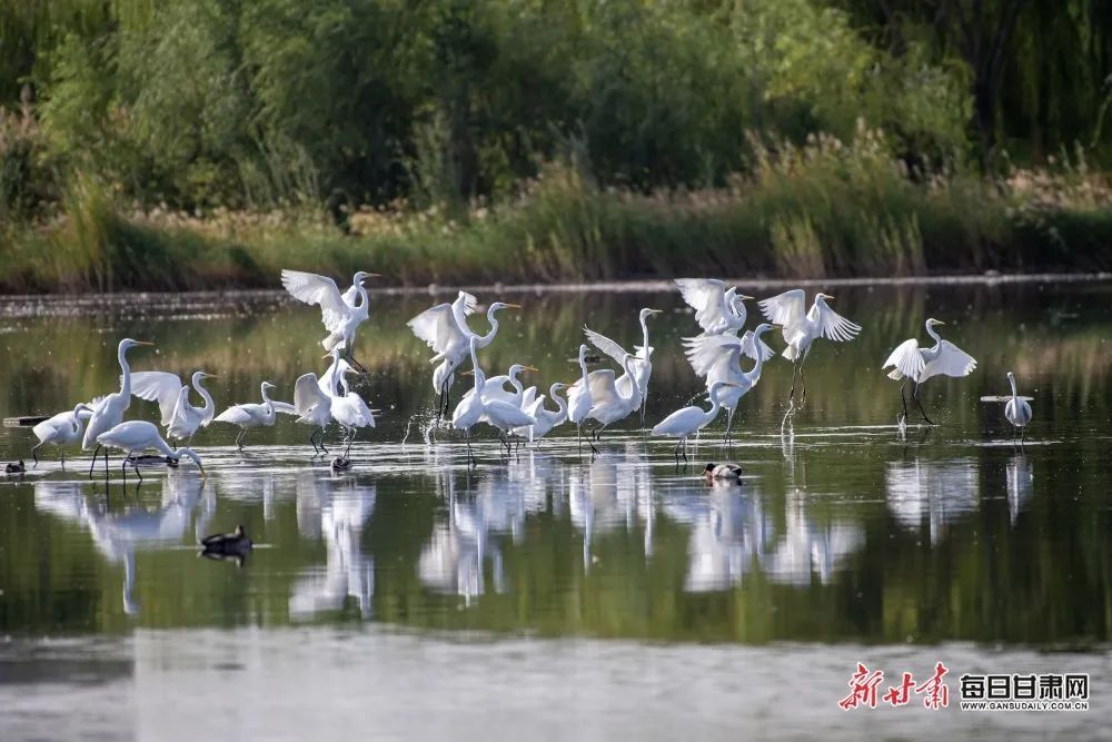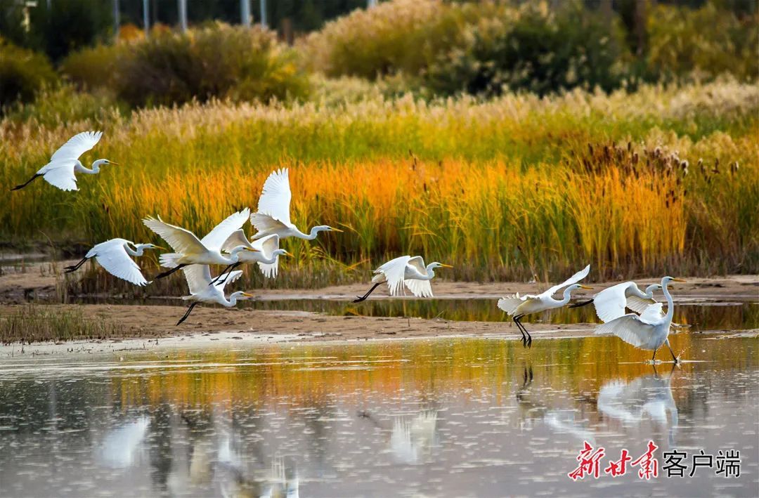 张掖国家湿地公园,晨曦中一只只白鹭翩翩起舞,掠过水面,勾画出秋色里的岁月静好。新甘肃·每日甘肃网通讯员 刘旭明