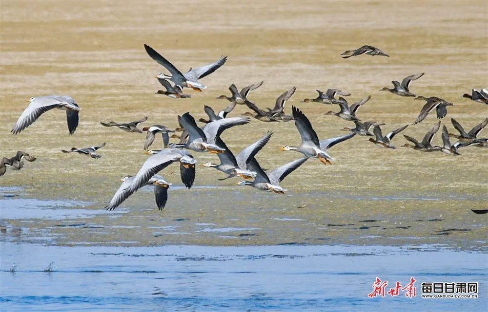 秋色渐浓,敦煌阳关国家级自然保护区,一群斑头雁在保护区核心地带渥洼池内翩跹起舞,神态各异。新甘肃·每日甘肃网通讯员 王斌银