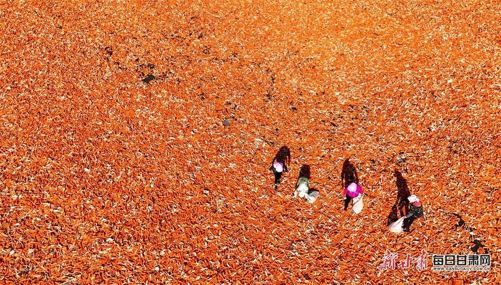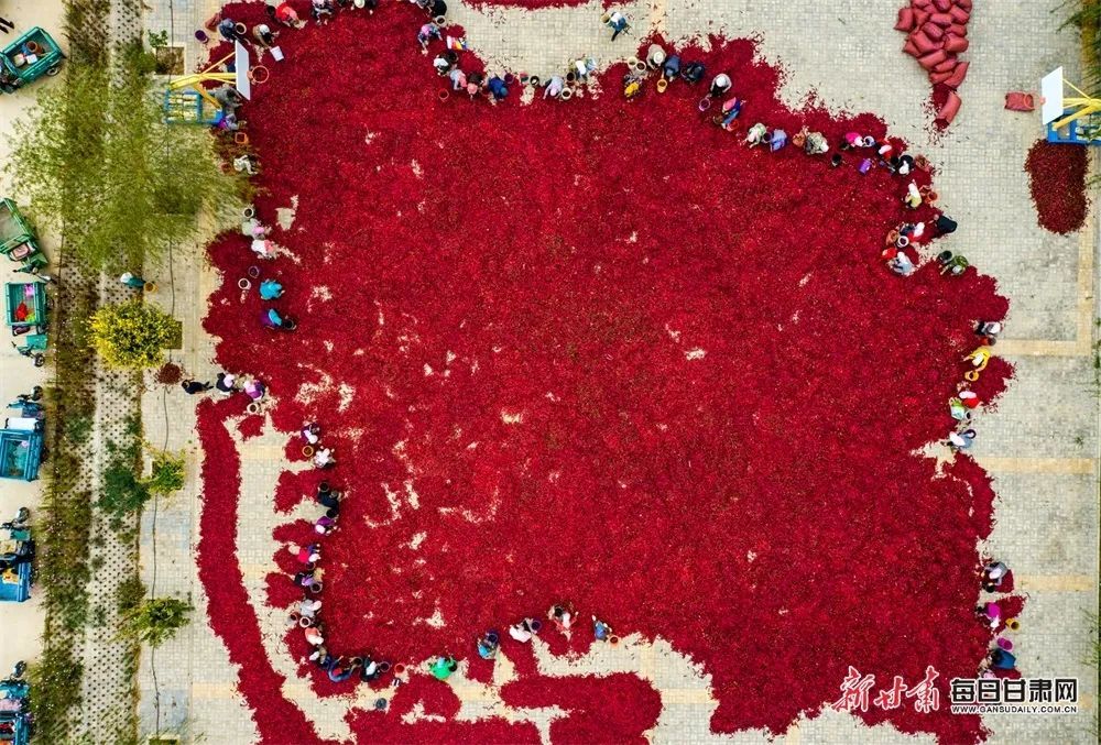 金秋时节,古浪县海子滩镇张家沙河村种植的红辣椒陆续进入采摘期,椒农们正忙着采摘、晾晒红辣椒。新甘肃·每日甘肃网通讯员 许吉年
