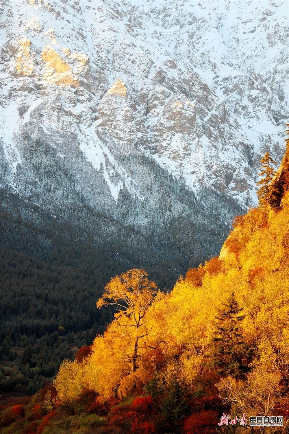 张掖市肃南县马蹄藏族乡境内,祁连雪山映衬下的树木色彩斑斓,景色宜人。新甘肃·每日甘肃网通讯员 王将 安文杰 李达