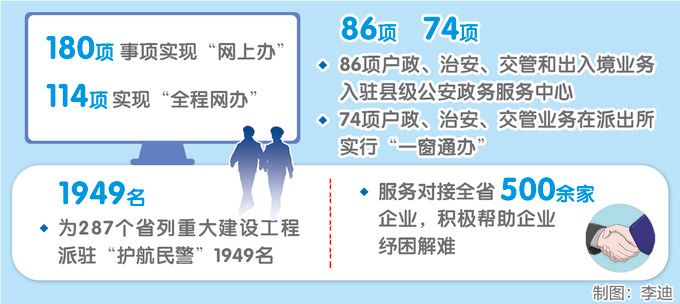 甘肃公安机关结合全省“优化营商环境攻坚突破年”行动,进一步精简审批服务事项,梳理、调整、确认涉及省市县公安机关行政许可事项155项,更新认领涉及公安业务办理系统服务事项211项,梳理公安机关行政备案网上办理事项17项,实行清单式管理和动态调整,更好满足企业和群众办事需求。同时,不断深化全省公安政务服务平台建设应用,180项事项实现“网上办”,114项实现“全程网办”,49项户籍事项实现网上统一收件、市州内跨派出所通办。加快推进全省公安政务服务“一窗通办”改革试点,精简群众企业办证、办事流程手续,86项户政、治安、交管和出入境业务入驻县级公安政务服务中心,74项户政、治安、交管业务在派出所实行“一窗通办”。此外,为287个省列重大建设工程派驻“护航民警”1949名,居民身份证实现全省范围“24小时制发、72小时送达”。服务对接全省500余家企业,积极帮助企业纾困解难。