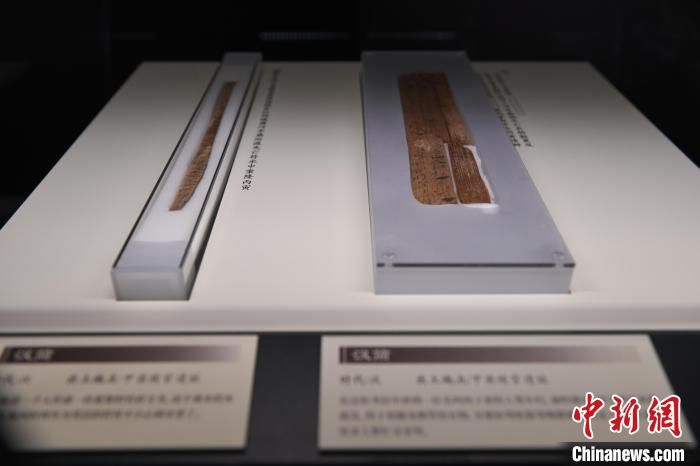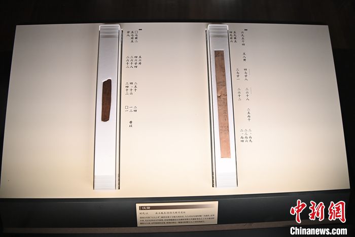 图为9月7日,甘肃兰州,甘肃简牍博物馆里展出敦煌马圈湾遗址出土的汉简“九九之数”。 中新社记者 九美旦增 摄
