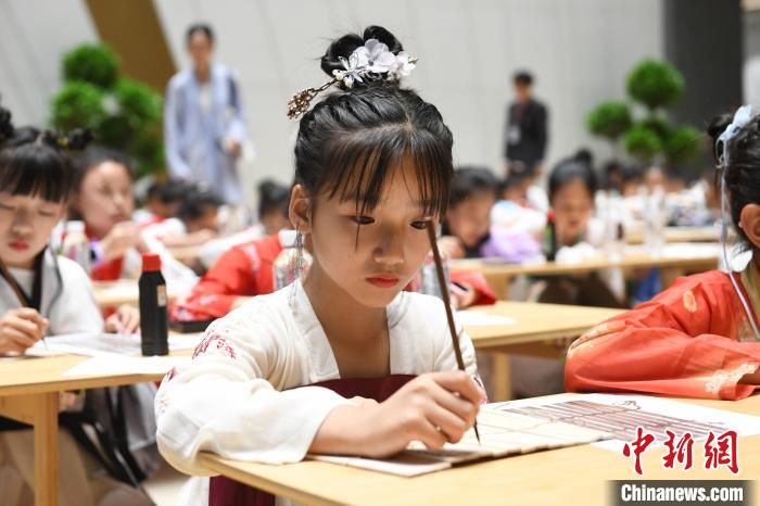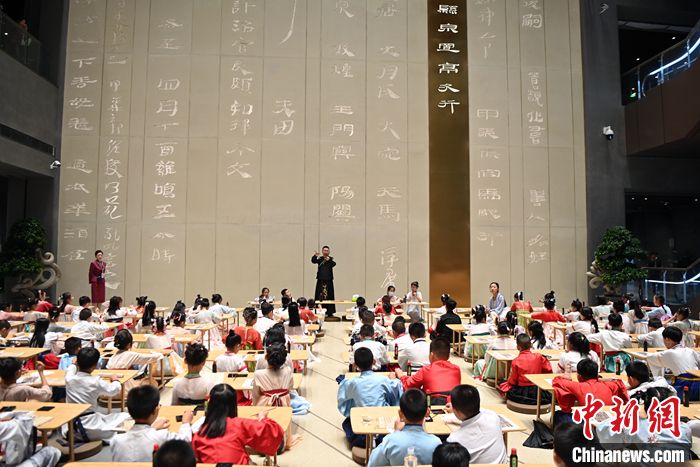 图为9月7日,小朋友们在位于甘肃兰州的甘肃简牍博物馆学习书写简牍中的文字。 中新社记者 九美旦增 摄