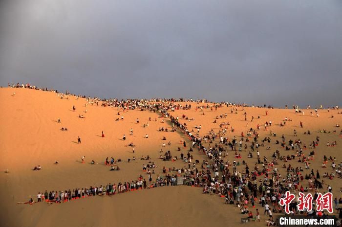2023年8月13日,游客在甘肃敦煌市鸣沙山月牙泉景区游览。(资料图)张晓亮 摄