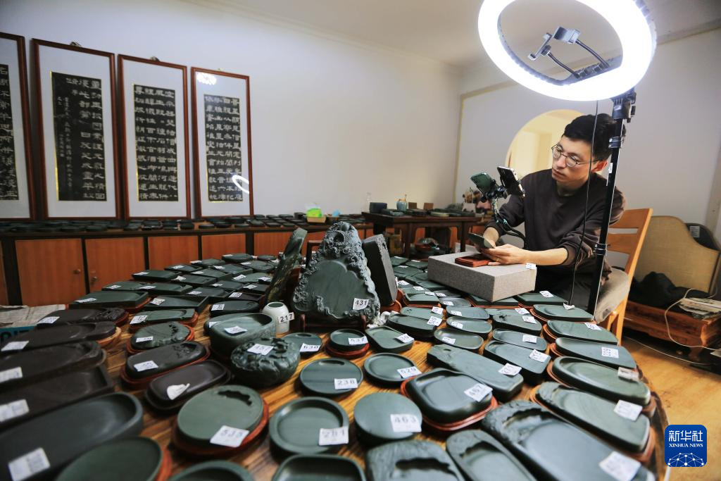 10月24日,工作人员在甘肃省定西市临洮县直播销售洮砚。新华社发(王克贤 摄)