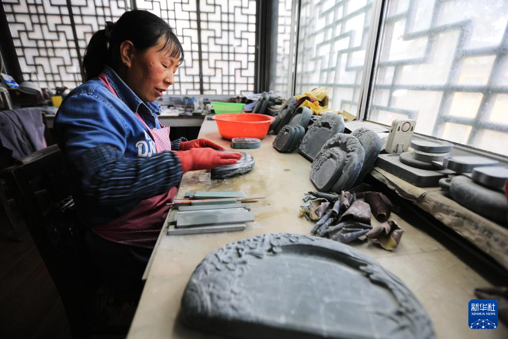 10月24日,艺人在甘肃省定西市临洮县洮砚艺术馆雕刻制作洮砚。新华社发(王克贤 摄)