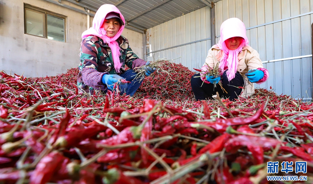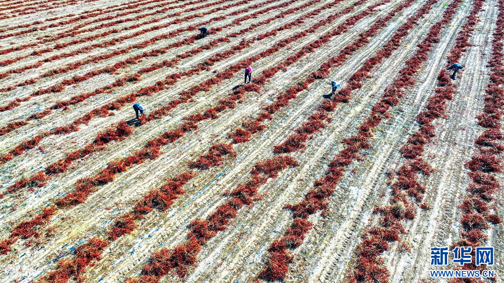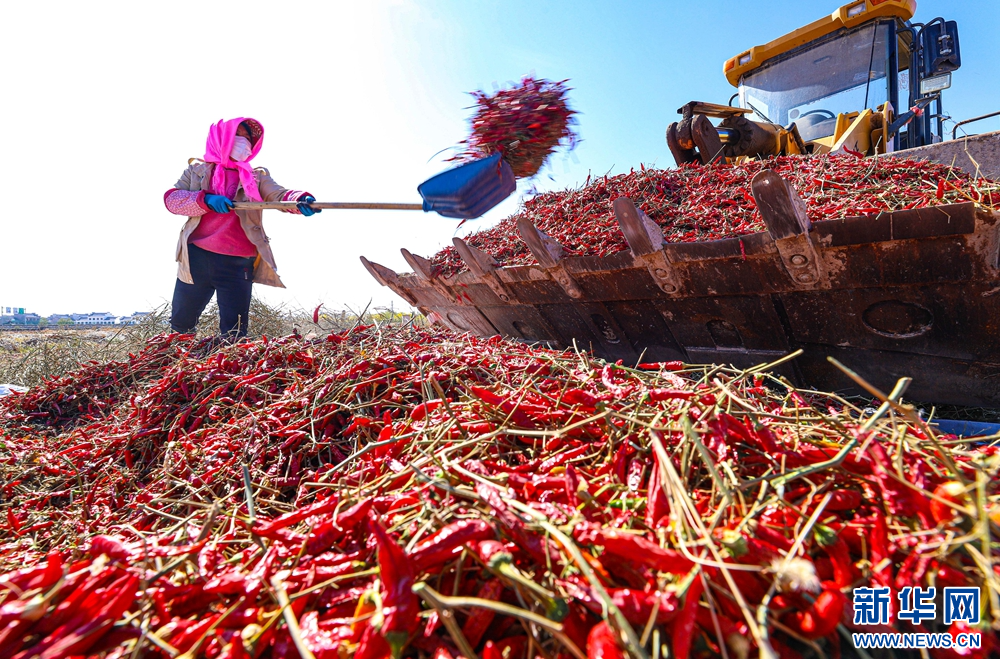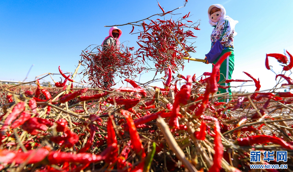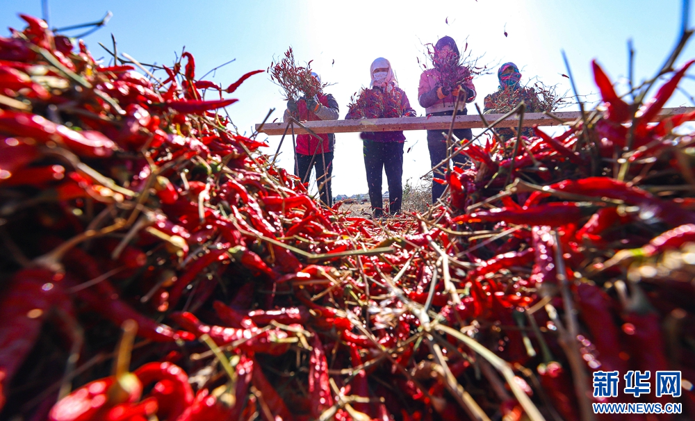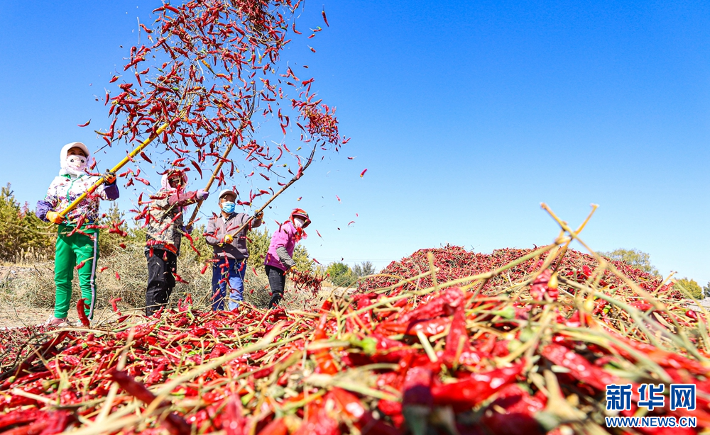 时下,甘肃省张掖市临泽县的1.8万亩朝天椒迎来收获季,村民们忙着采摘、搬运、晾晒朝天椒,一派喜人的丰收景象。新华网发(王将 摄)